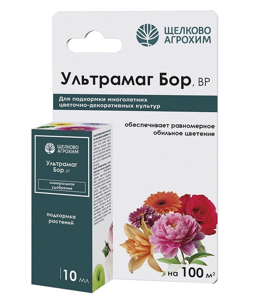 «Ультрамаг Бор» – жидкое минеральное микроудобрение для подкормок любых культур в фазе бутонизации и цветения. Опрыскивание рабочим раствором по листу значительно повышает качество пыльцы, скорость её прорастания и препятствует осыпанию завязей, а в дальнейшем улучшает и качество плодов. Препарат содержит 4,7 % азота, что облегчает усвоение бора растениями. Как результат ликвидирован недостаток бора, улучшено качества и количества урожая, при этом отсутствует риск передозировки.