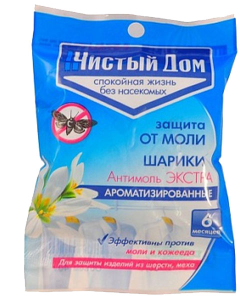 Уничтожает моль, личинки и кожееда. В упаковке весом 40 г. / 10 ароматизированных шариков. Шарики разместить среди подготовленных к хранению шерстяных вещей из расчета 2-3 шарика на одну секцию платяного шкафа или разместить в чемоданах, коробах.