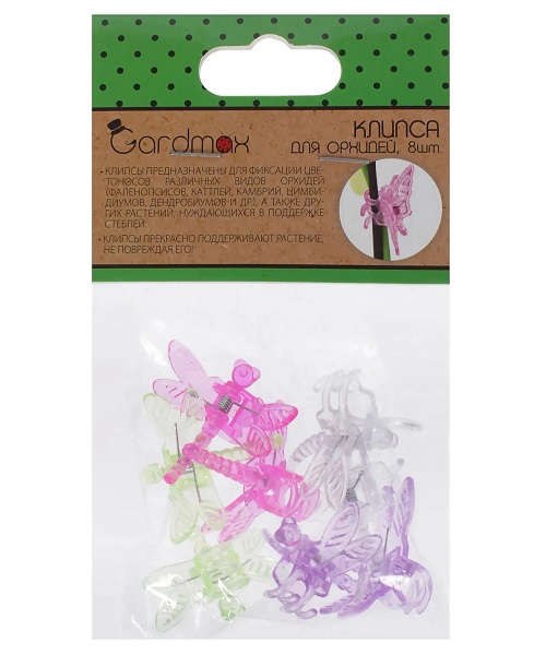 Клипсы для орхидей "Gardmax" изготовлены из пластика и металла. Идеально подходят для орхидей и других комнатных растений. Предназначены для фиксации стеблей и цветоноса растения к опоре.