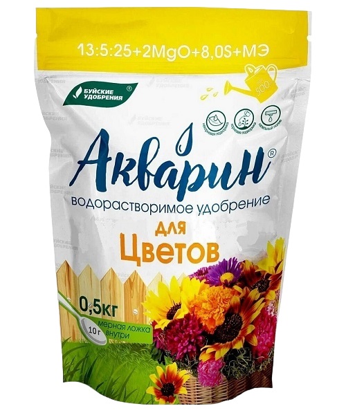 Акварин для Цветов - водорастворимое удобрение, в состав которого входит азот, фосфор, калий, магний, сера и микроэлементы – железо, цинк, марганец, медь в хелатной форме, а бор и молибден – в минеральной. Благодаря кислой реакции (рН) удобрения, оно легко растворяется в холодной воде и более эффективно усваивается корневой системой или листовой поверхностью растений.