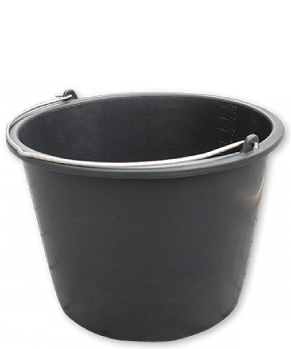 Прочное ведро из упругого пластика с металлической ручкой и мерной линейкой внутри.