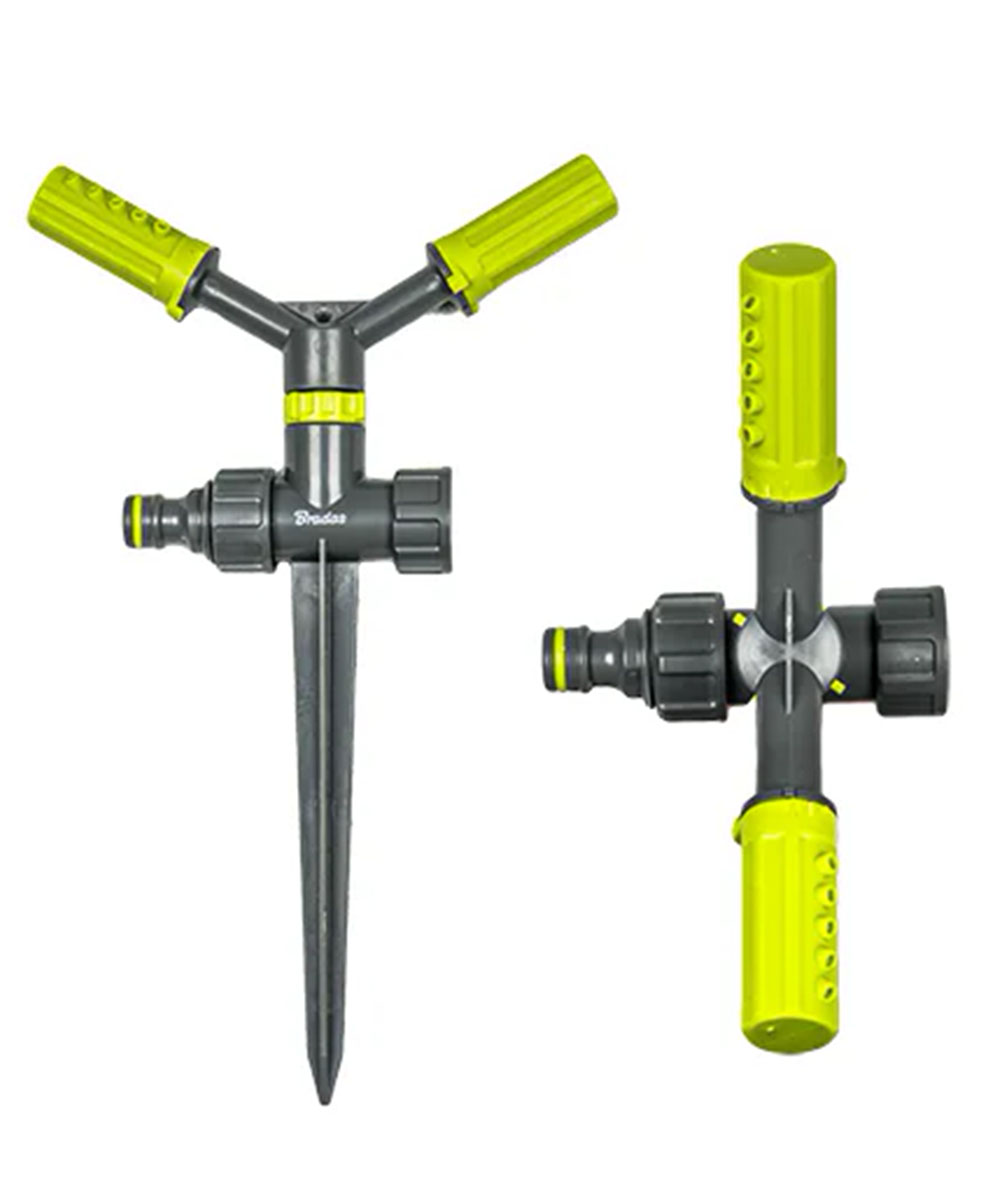 Пластмассовый вращающийся разбрызгиватель с колком для втыкания в землю. Стандартный штуцер для быстросоединителей, резьба с возможностью последовательного соединения нескольких разбрызгивателей.