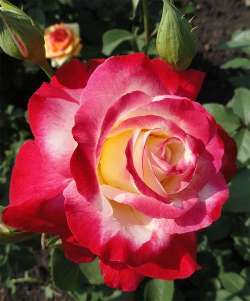 Очень популярная роза. Раскрывающийся бутон идеальной классической формы, медленно распускается. Цветки вначале кремово-белые, с красным только на внешних лепестках, по мере распускания малиновая окраска расширяется, особенно в жаркую погоду, очень крупные (13-14 см), с насыщенным пряным ароматом. Куст прямостоячий, хорошей формы, дает много побегов. Сорт очень легок в выращивании. Цветы долго стоят в срезке.