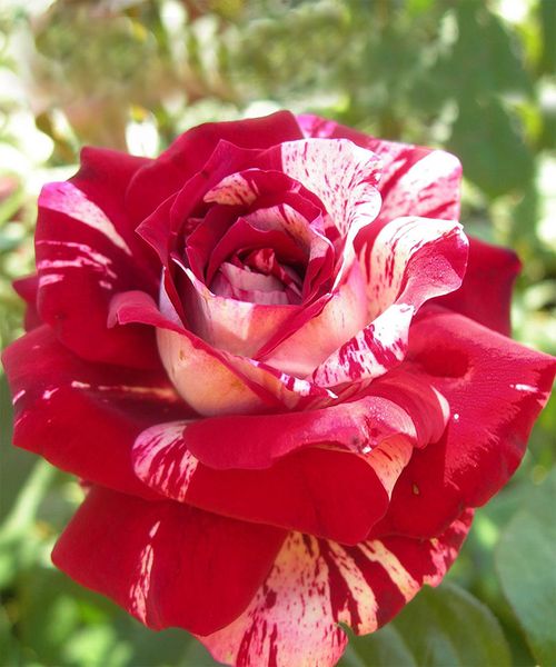 Необычная роза с оригинальной окраской. Цветки 10-11 см в диаметре, малиновые с кремово-белыми полосами и штрихами, обладают сильным цитрусовым ароматом. Цветение очень обильное и продолжительное. Куст компактный, высотой 60-80 см.