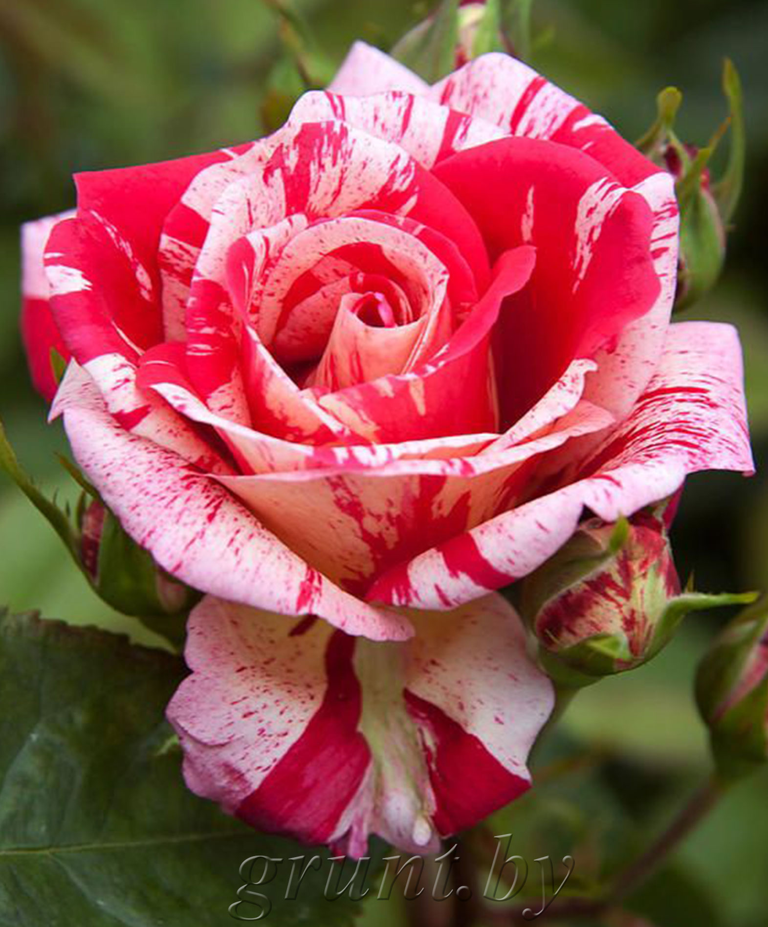 Очень эффектно выглядящий в саду сорт. Цветы крупные (9-10 см), малиново-красные с белыми полосками, почти без запаха. Куст сильнорослый, до 1,2 м в высоту, хорошо облиственный. Листва светло-зеленая. Зимостойкий и сильнорослый сорт.