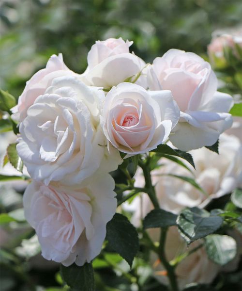 Изящная неприхотливая флорибунда. Цветки красивой формы, 5-6 см в диаметре, белоснежные в жаркую погоду, и с розовым оттенком в центре в более прохладную. Они появляются в огромном количестве в кистях по 2-15 шт, так что весь куст покрыт цветами. Куст хорошей формы, густой, высотой 50-70 см, иногда больше в ширину, чем в высоту, с мелкой листвой. Сорт очень устойчив к заболеваниям, хорошо зимует