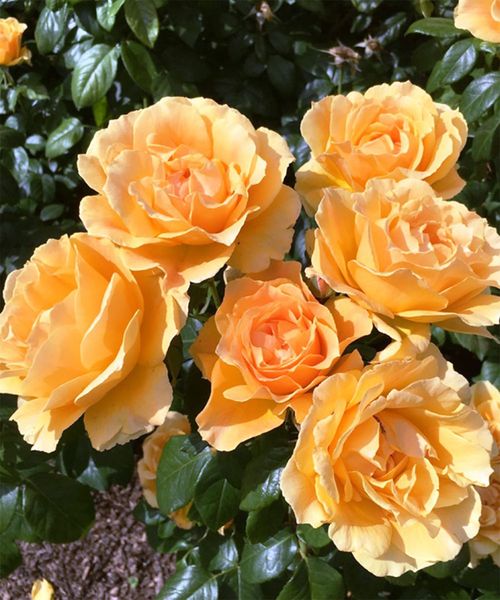 Яркая флорибунда с обильным и непрерывным цветением. Цветки абрикосовые с красным оттенком, махровые, диаметром 6-7 см, с легким ароматом, собраны в соцветия по 5-10 шт. Куст крепкий, высотой 60-70 см, листья глянцевые. Зимостойкость и устойчивость к болезням хорошая.