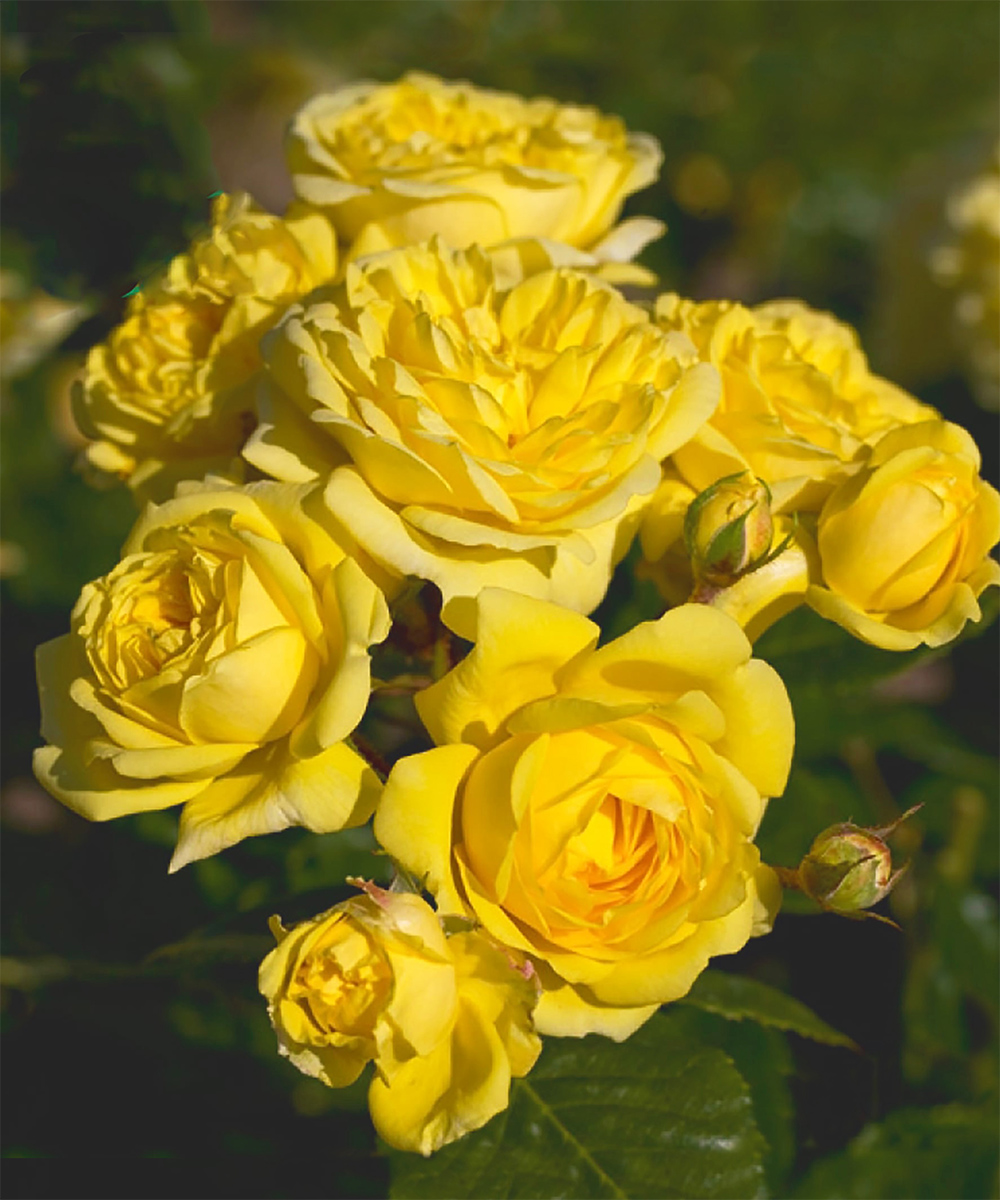 Лучшая среди желтых флорибунд. Цветки красивого ярко-желтого цвета, с более темной обратной стороной лепестков, диаметром до 10 см, имеют легкий аромат. Они лишь слегка выгорают и держат красивую форму. Ароматные цветы появляются по одному или в кистях по 3-7 шт, долго держатся. Куст компактный, высотой до 80 см и шириной до 70 см с темно-зеленой блестящей листвой. Сoрт устoйчив к бoлeзням, зимoстoйкий.