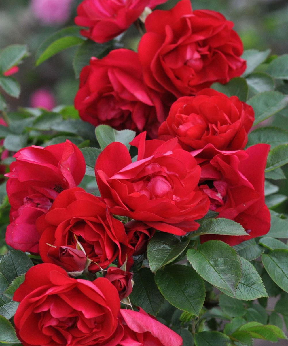 Превосходный сорт в красных тонах. Цветки яркие, густо-красные, очень крупные (диаметр до 12 см), махровые, в кистях. Они долго не опадают и устойчивы к дождю. Аромат легкий. Листва темно-зеленая, очень блестящая. Куст ветвистый, прямостоячий, достигает 150 см в высоту и около 70 см в ширину. Обильное повторное цветение осенью. Превосходная устойчивость к болезням.