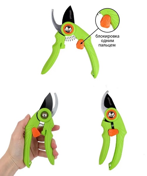 Секатор оснащен надежным фиксатором, который приводит инструмент в безопасное состояние.