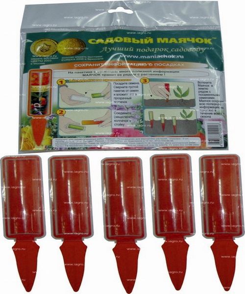 На пакетике с семенами много полезной информации! Маячок хранит её рядом с растением! Посадите семена. Сверните пустой пакетик от семян и вложите его в прозрачный колпачок. Соедините (защелкните) колпачок и стойку. Воткните маячок в землю рядом с высаженными семенами. Маячок хранит полезную информацию в течение всего сезона. В комплекте - 5 маячков.