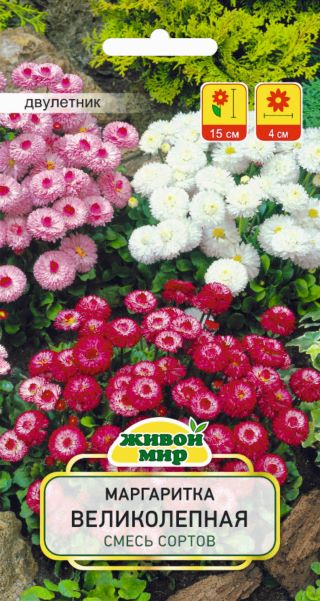 Зацветает в мае, цветет до конца июля. Яркая смесь маргариток хороша для оформления клумб, бордюров, балконных контейнеров, хорошо смотрится группами на газонах.