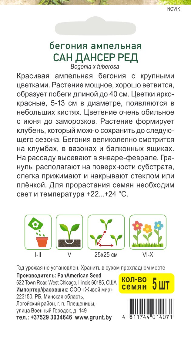 Бегония ампельная Сан Дансер F1 Ред (PanAmerican Seed) 5 шт, РБ