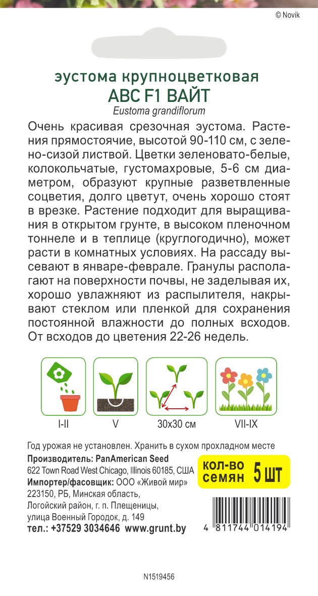 Эустома крупноцветковая АВС F1 Вайт (PanAmerican Seed) 5 шт, РБ