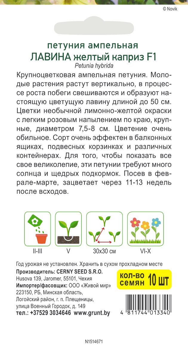 Петуния ампельная крупноцветковая Лавина Желтый каприз F1 (Cerny seed) 10 шт, РБ