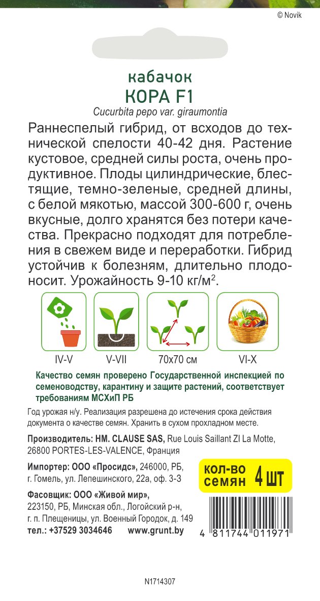 Кабачок Кора F1 (Clause) 4 шт, РБ