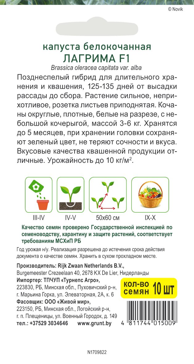 Капуста белокоч. Лагрима F1 (Rijk Zwaan) 10 шт, РБ