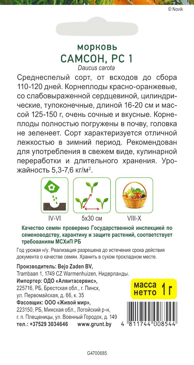 Морковь Самсон F1 (Bejo Zaden) 1 г, РБ