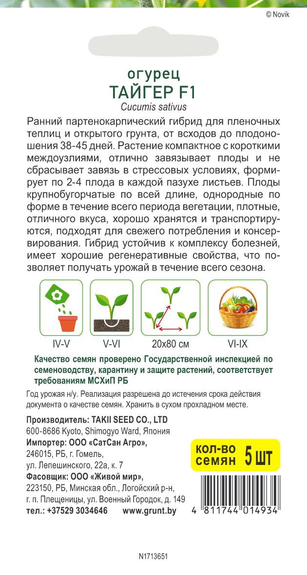 Огурец Тайгер F1 (Takii seed) 5 шт, РБ
