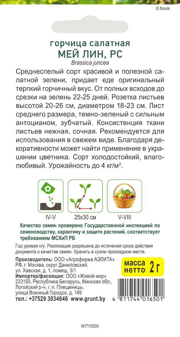 Среднеспелый сорт красивой и полезной салатной зелени, придает еде оригинальный терпкий горчичный вкус. От полных всходов до срезки на зелень 22-25 дней.