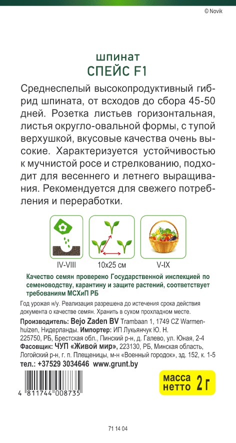 Среднеспелый высокопродуктивный гибрид шпината, от всходов до сбора 45-50 дней.