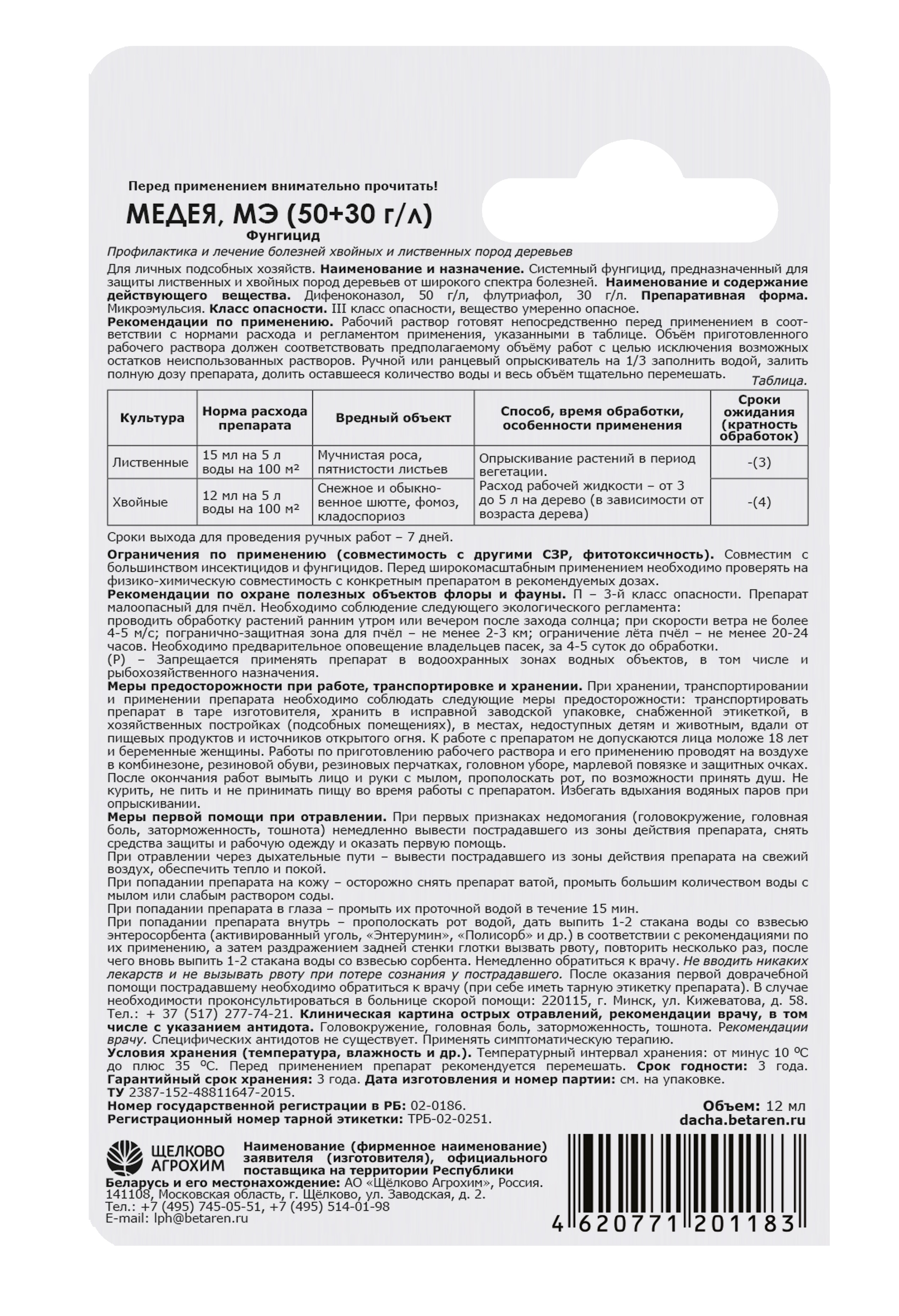 Инструкция Действующее вещество: Дифеноконазол, 50 г/л и Флутриафол, 30 г/л Как готовить рабочий раствор: 24-30 мл на 10л воды Расход: 3-5л на дерево (в зависимости от возраста дерева) Подробную инструкцию см на упаковке Меры безопасности при работе: - избегать контакта средства с кожей и слизистыми оболочками глаз. - хранить препарат отдельно от лекарств, пищевых продуктов и кормов для животных в сухом, прохладном месте, недоступном для детей и животных. - после работы со средством вымыть руки водой с мылом. Запрещается: - попадание средства в сточные (поверхностные), подземные воды и канализацию. - использовать посуду (емкости) для пищевых продуктов и питьевой воды для размещения гранул препарата.