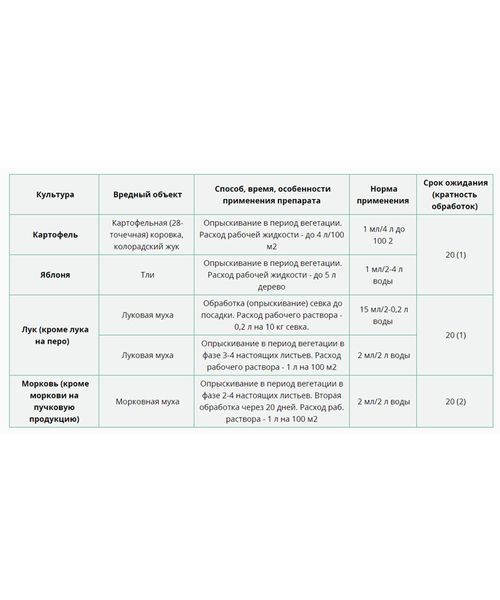 Для борьбы с колорадским жуком и тлей. Системный препарат — защищает даже молодой прирост, растущий после опрыскивания.