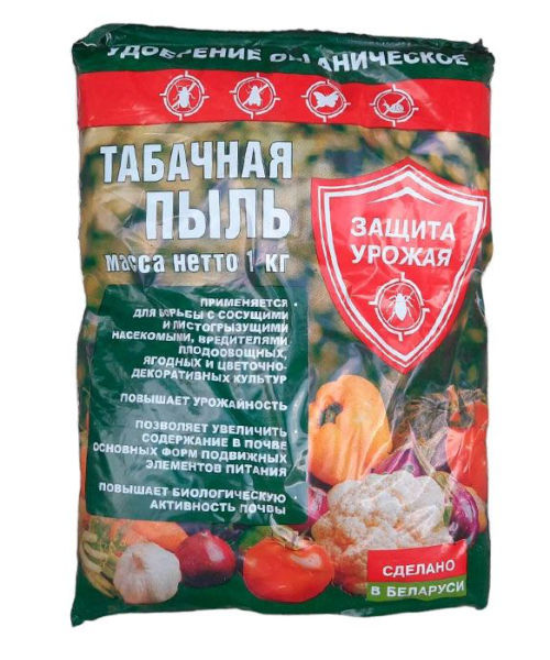 Биологически чистое средство, используемое в виде природного инсектицида для борьбы с различными паразитами. С ее помощью можно быстро избавить свой огород или сад от множества вредоносных насекомых вроде тли, мошки, плодовой моли, трипсов, слизней и пр. Табачную пыль можно использовать для обработки плодовых, ягодных и цветочных культур. Помимо того, что табачная пыль – экологически чистое средство от паразитов растений, она может использоваться и в качестве органического удобрения. Она улучшает питание растений, активизирует работу микроорганизмов в почве и восполняет дефицит важных микроэлементов.